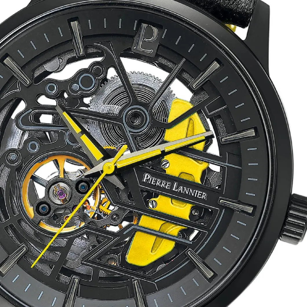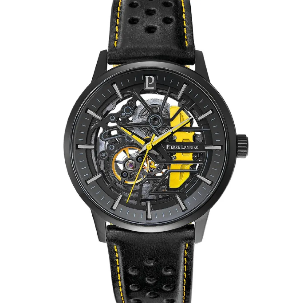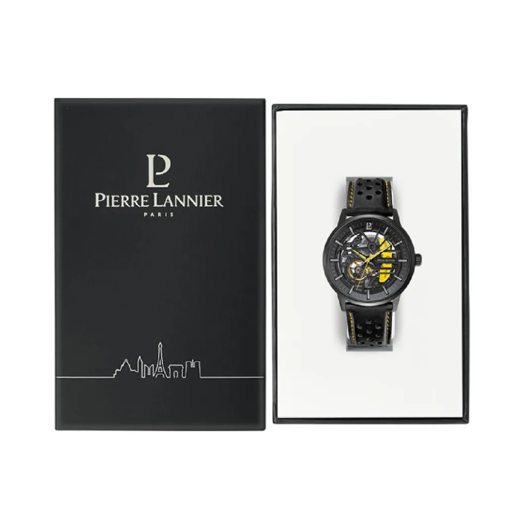 La Montre Homme Pierre Lannier Paddock est dotée d’un boitier en acier de couleur noir, complété par un bracelet en cuir de la même couleur. Sa fermeture est assurée par une boucle simple. Sa forme ronde a un diamètre de 43mm, et son affichage est analogique. Ce garde-temps de marque Pierre Lannier fonctionne grâce à un mouvement automatique, et est étanche jusqu’à 50m (5 ATM). Son verre minéral assure une excellente protection.
