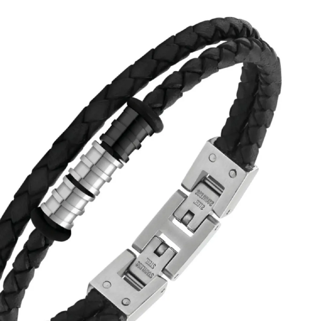 - Details : 8mm Cuirs tressés Noir et perles Acier poli 21cm