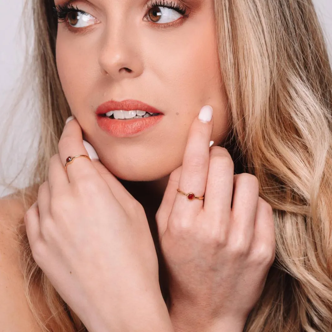 Le plaquage or 18 carats offre à la bague Gemia une lueur chaleureuse et intemporelle, rehaussant la beauté naturelle de la gemme de Grenat. Cet équilibre parfait entre un design épuré et des matériaux de haute qualité en fait un joyau unique.