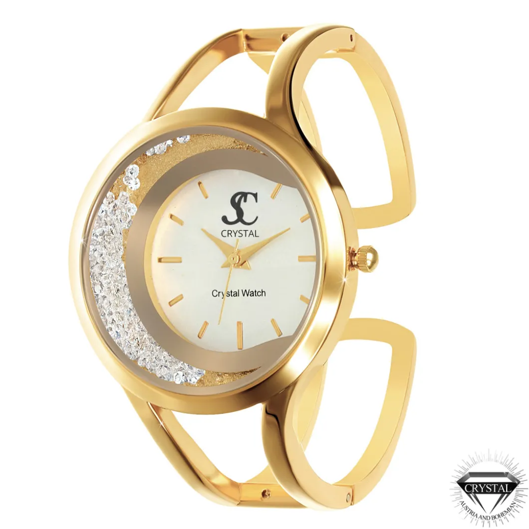 Pour briller à toute heure de la journée, la Montre femme MF396-DORE – So Charm est incrustée de plusieurs cristaux blancs en mouvement, près de son cadran. Son style en manchette est très gracieux.